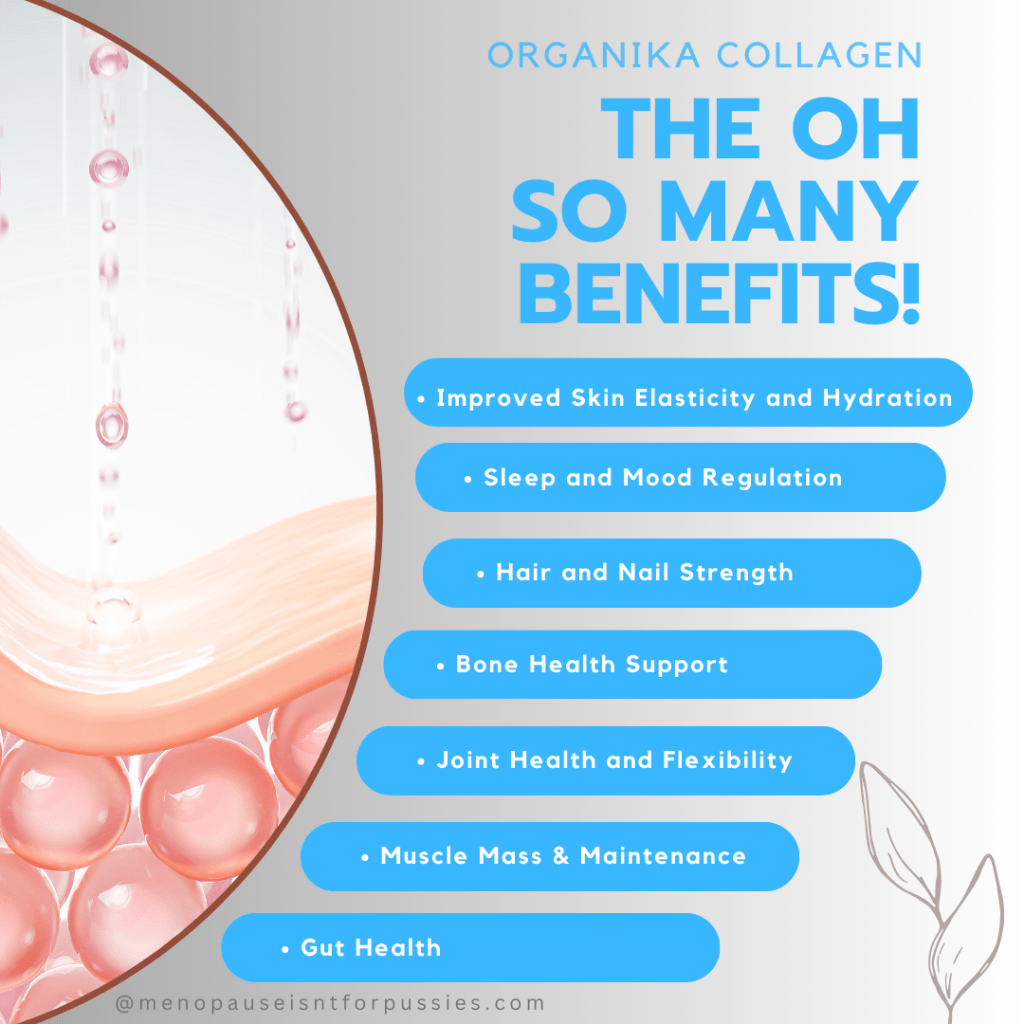 Certain studies have found that collagen, particularly the amino acid glycine, can enhance sleep quality and encourage relaxation, which might indirectly benefit mood and energy for menopausal women. We all know how important that is as we age! We struggle to sleep well, and the light-hearted version of oneself seems to disappear.